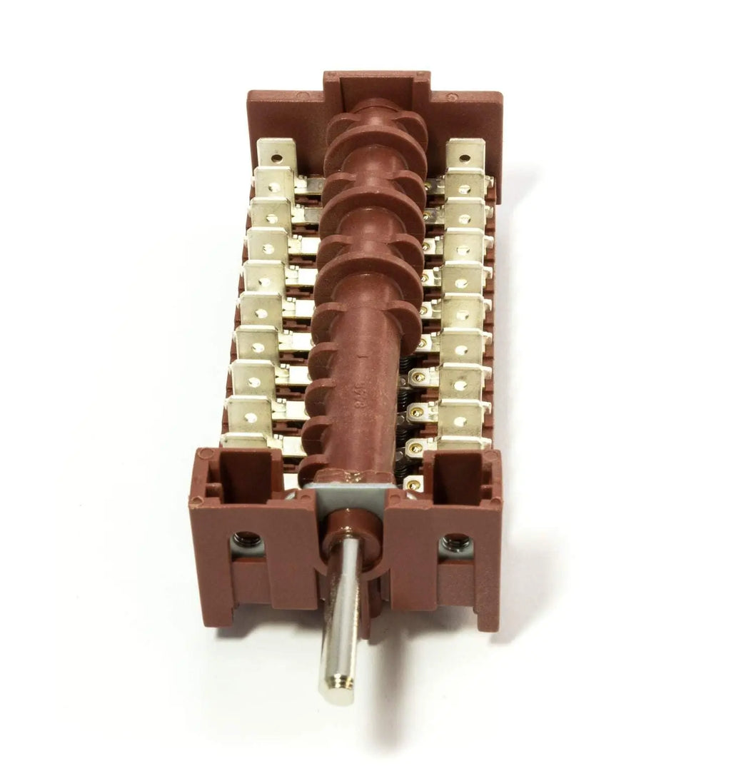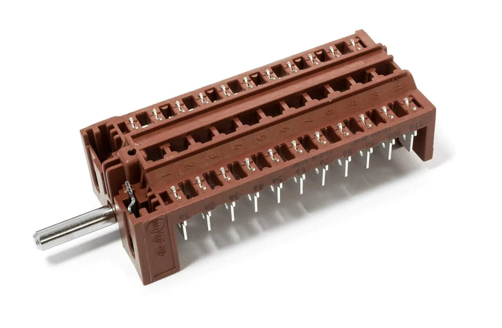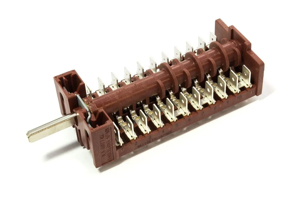 Il commutatore per forno GottaK 841100 appartiene alla serie 7LA, offrendo 4 posizioni e 11 poli. La sua portata di contatti è fino a 16A e 250V, a una temperatura massima di 140°C. L'alberino è di 23mm con un perno in mezzaluna ø 6x4,6 mm.