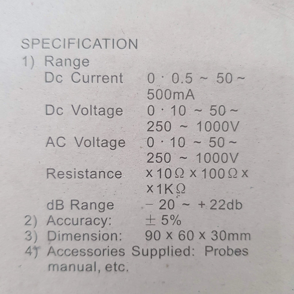 DCV 0-2,5-10-50-250-500 V + ACV 0-10-50-250-500 V + DC mA 0-500 - 10mA - 250mA + RESISTENZA + BATT. Test mm 95 x 60 x 28 h